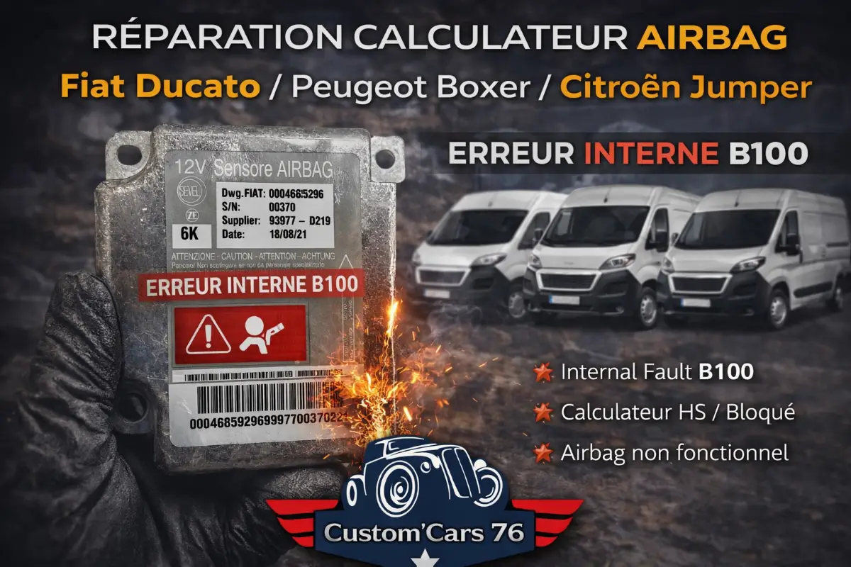 Réparation Calculateur Airbag B100 Fiat Ducato, Peugeot Boxer, Citroën Jumper en Normandie (Seine-Maritime 76 – Dieppe, Rouen, Le Havre, Eu, Abbeville, Neufchâtel-en-Bray, Fécamp, Yvetot, Barentin, Montivilliers, Gonfreville-l'Orcher, Luneray, Offranville, Saint-Nicolas-d'Aliermont, Auffay, Tôtes, Aumale, Le Tréport, Bolbec, Lillebonne, Harfleur, Déville-lès-Rouen, Sotteville-lès-Rouen) – Défaut Airbag Allumé, Erreur Interne B100, Calculateur Bloqué ou HS | Custom’Cars 76