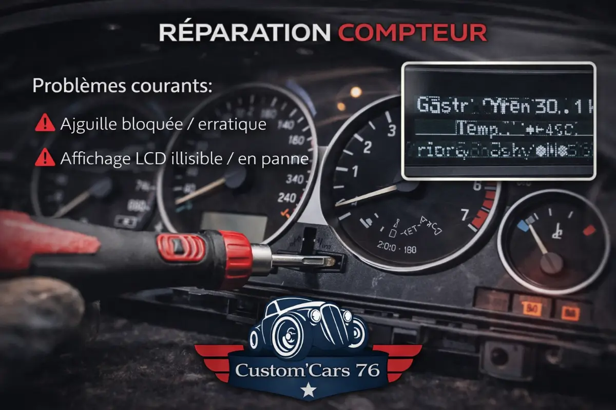 Votre compteur automobile présente des signes de dysfonctionnement ? Aiguille bloquée, affichage LCD illisible ou aiguille erratique ? Faites confiance à Custom'Cars 76 pour une réparation rapide et efficace en Normandie. Nous intervenons à Dieppe, Rouen, Le Havre, Eu, Abbeville, Fécamp et Yvetot, ainsi que dans les communes avoisinantes.